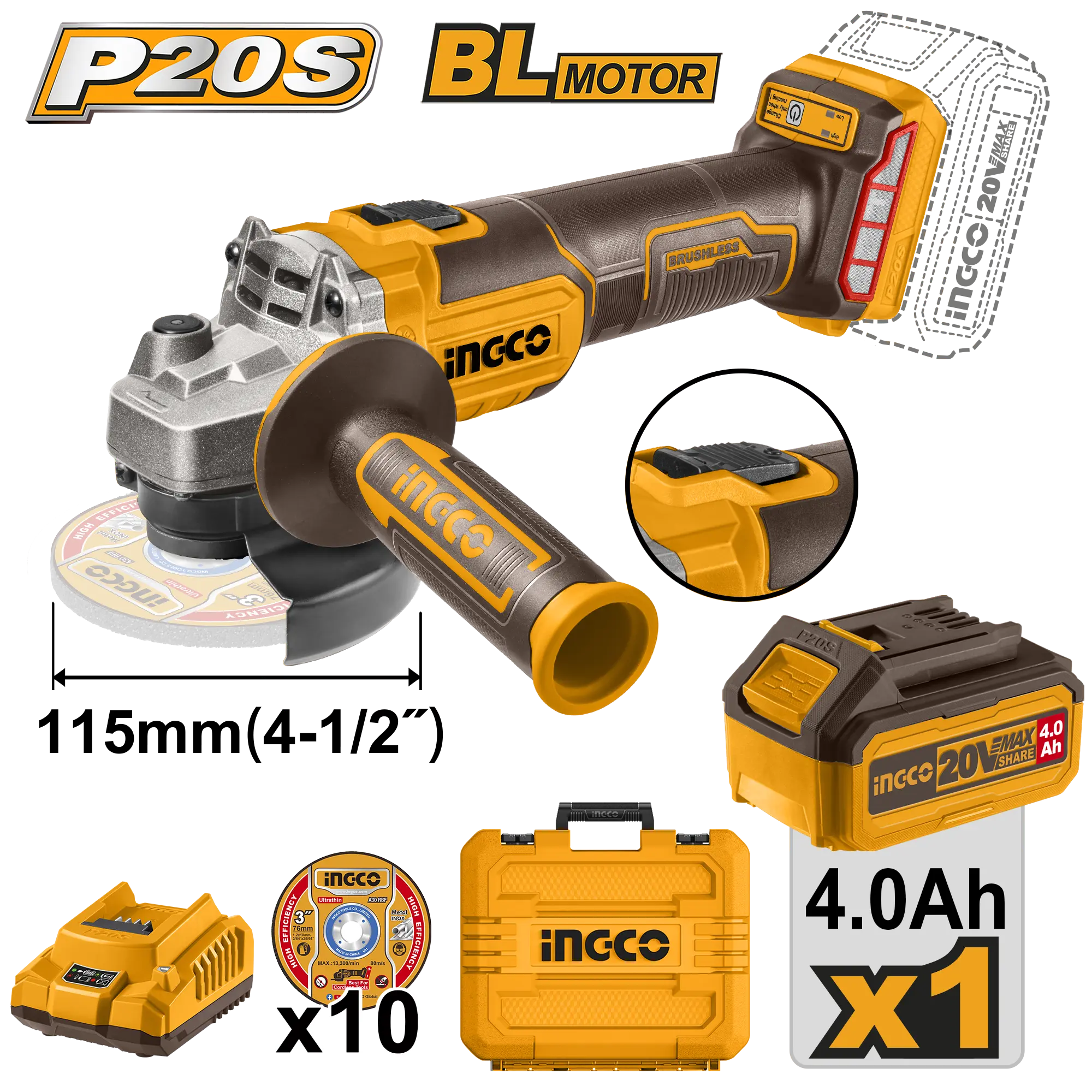 - Producto: AMOLADORA ANGULAR 4-1/2 BL 20V + 1 BAT 4.0AH + CARG + MALETA INGCO