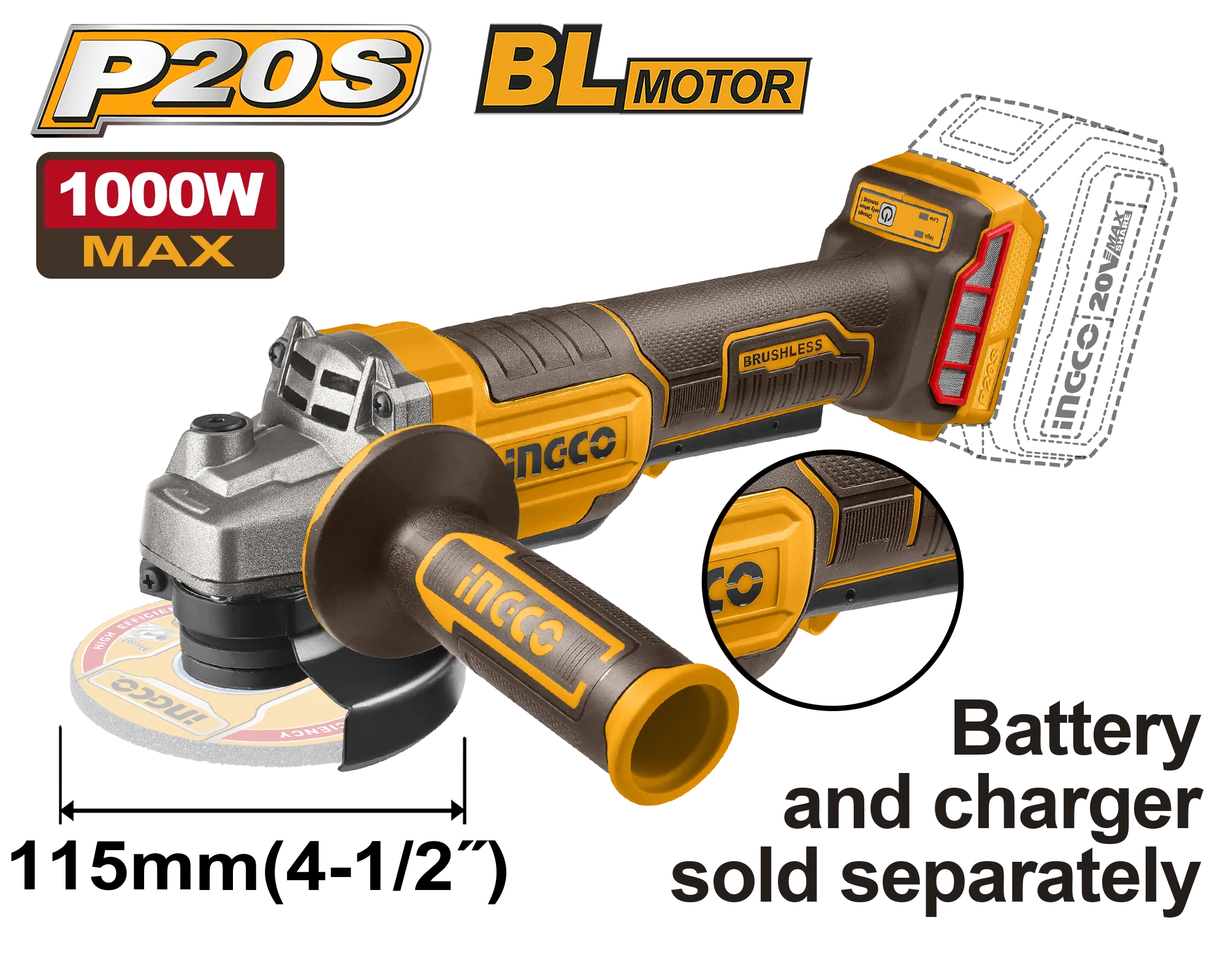 • Producto: AMOLADORA ANGULAR 4-1/2″ BL 20V 8000RPM INGCO