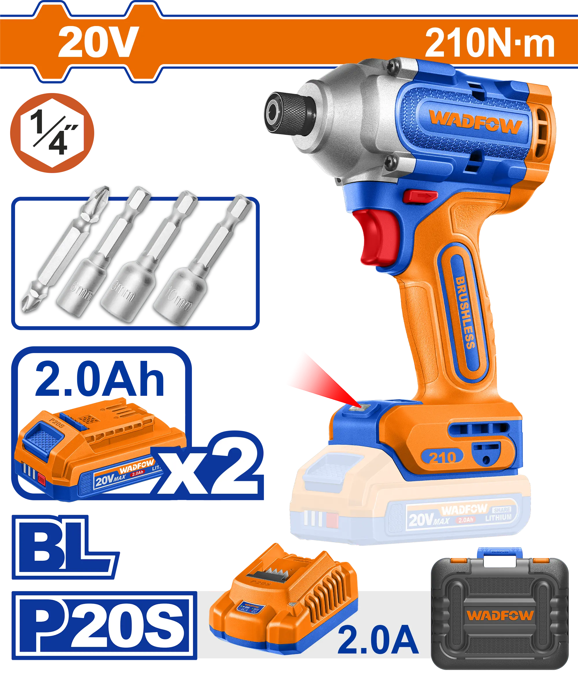 - Producto: ATORNILLADOR DE IMPACTO 1/4″ BL 20V 210N.M + 2 BAT 2.0AH + CARG + MALETA WADFOW