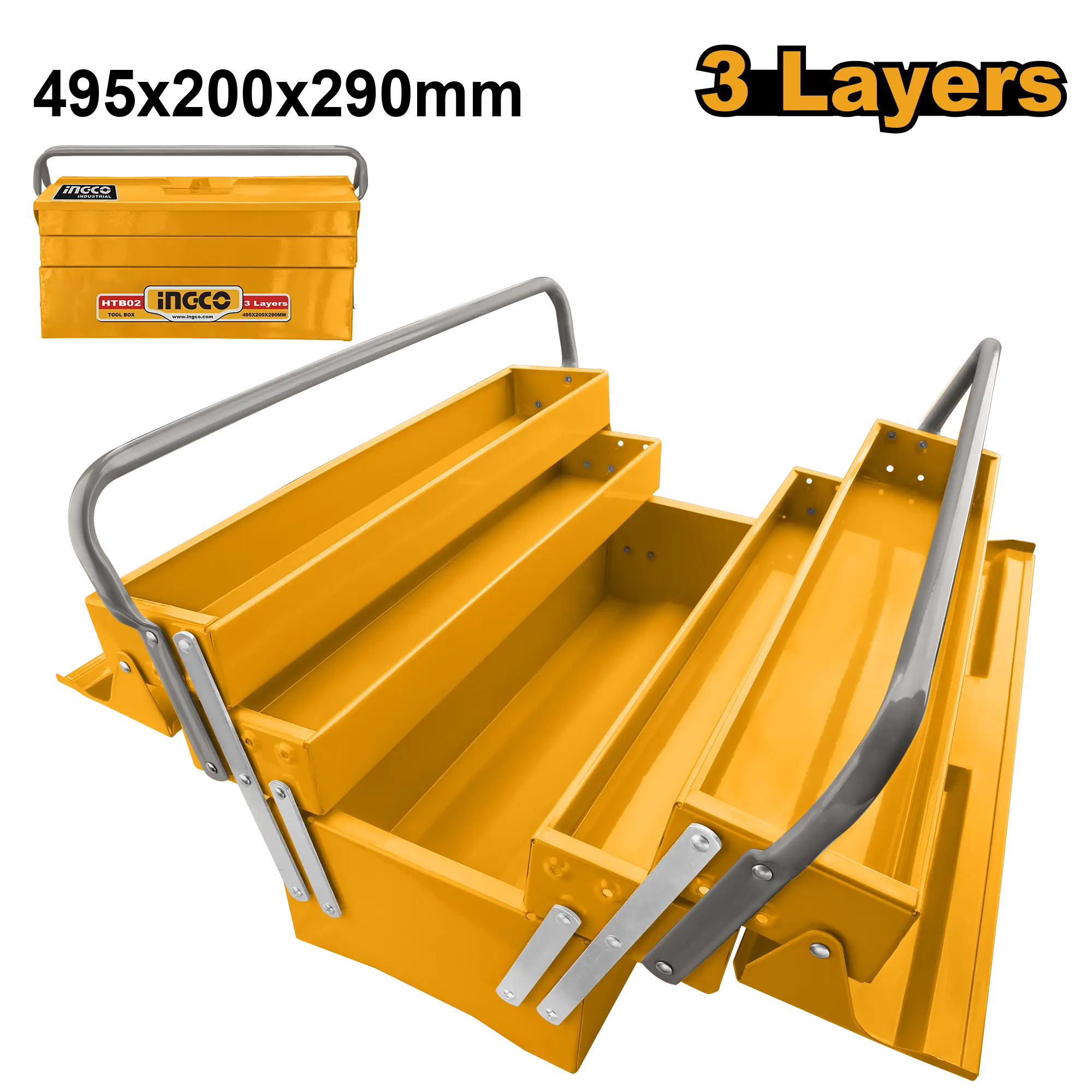 CAJA DE HERRAMIENTAS 495X200X290MM INGCO es un producto dentro de la categoría Herramientas manuales. Marca detectada: Ingco. Producto orientado a uso práctico según su nombre y datos detectables, con foco en compatibilidad y seguridad. Datos detectados: Medida: 290 mm. Nota: Tamaño: 495x200x290mm\n3 capas\nEspesor del acero: 0.