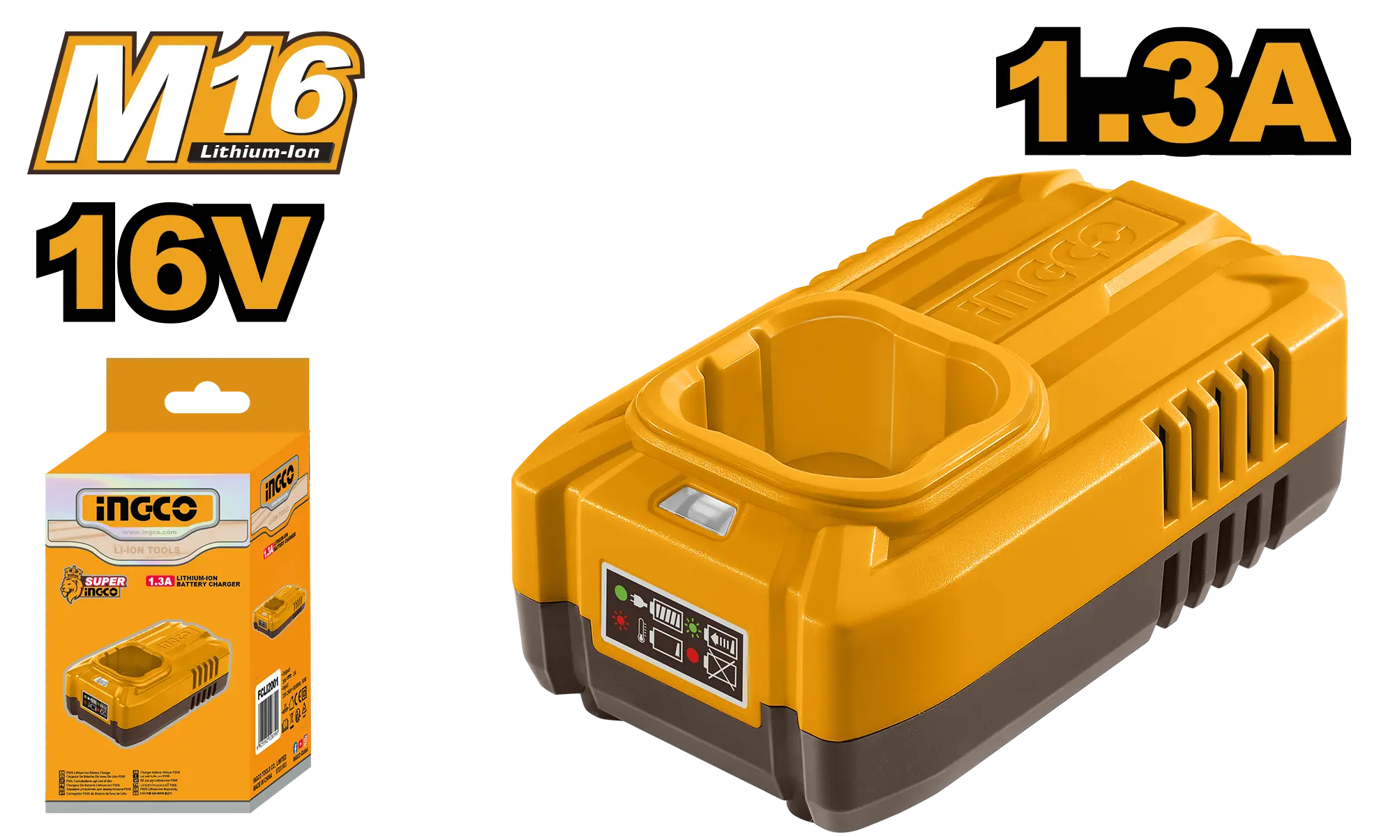 CARGADOR DE BATERIA 16V 1.3A INGCO es un producto dentro de la categoría Herramientas inalámbricas. Marca detectada: Ingco. Producto orientado a uso práctico según su nombre y datos detectables, con foco en compatibilidad y seguridad. Datos detectados: Voltaje: 16 V. Nota: Voltaje de entrada: 110 120 V ~ 50/60 Hz \nVoltaje de salida: 16 V \nCorriente de salida: 1,3 A Empaquetado en caja de color.