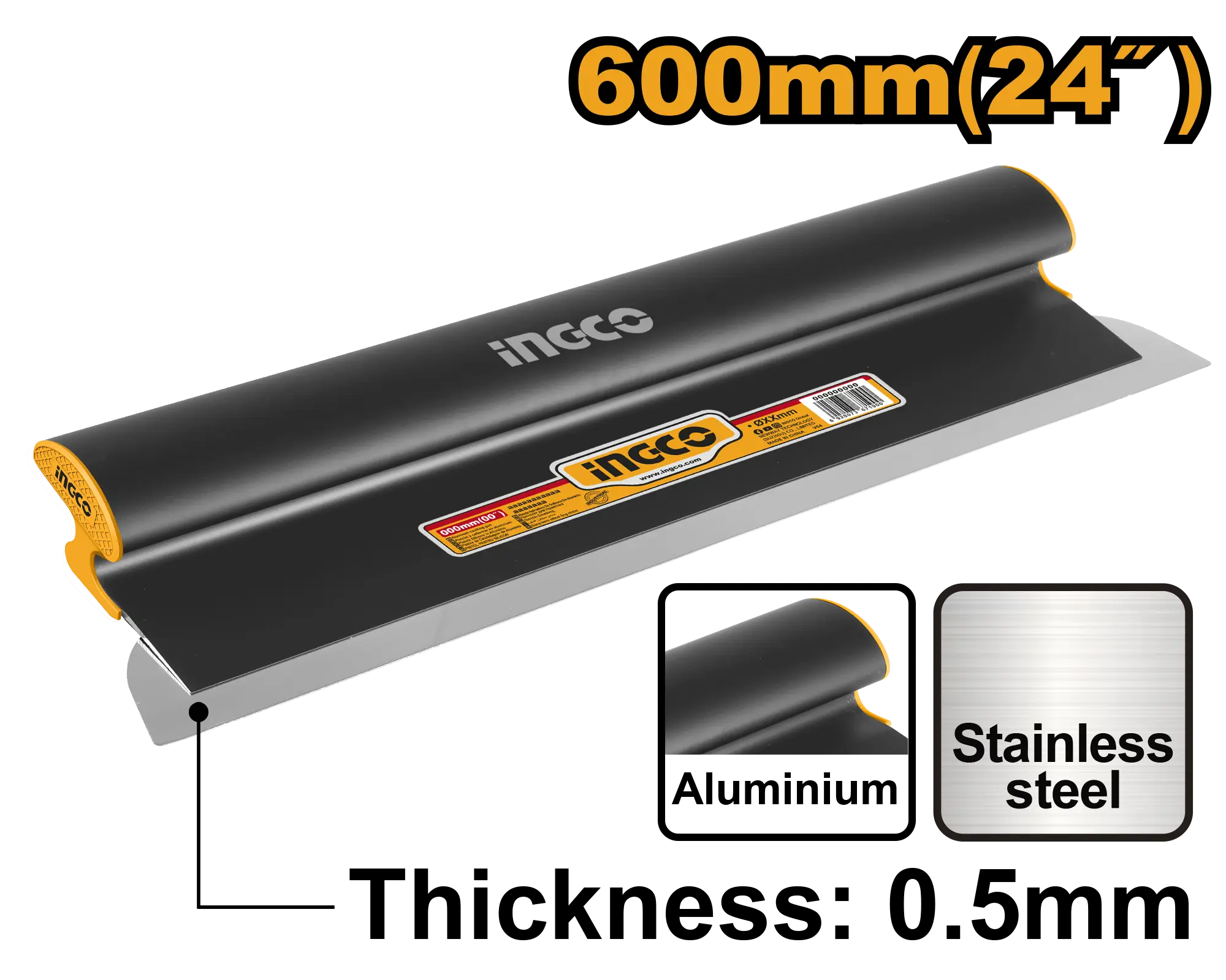 CUCHILLA RASPADORA DE PANELES DE YESO 600MM INGCO es un producto dentro de la categoría Herramientas manuales. Marca detectada: Ingco. Producto orientado a uso práctico según su nombre y datos detectables, con foco en compatibilidad y seguridad. Datos detectados: Diámetro: 24″; Medida: 600 mm; Material: Acero inoxidable / Aluminio. Nota: Tamaño: 24″ \nMaterial de la hoja: acero inoxidable \nMaterial del mango: aleación de aluminio \nGrosor de la hoja: 0,5 mm \nEmbalado por etiqueta.