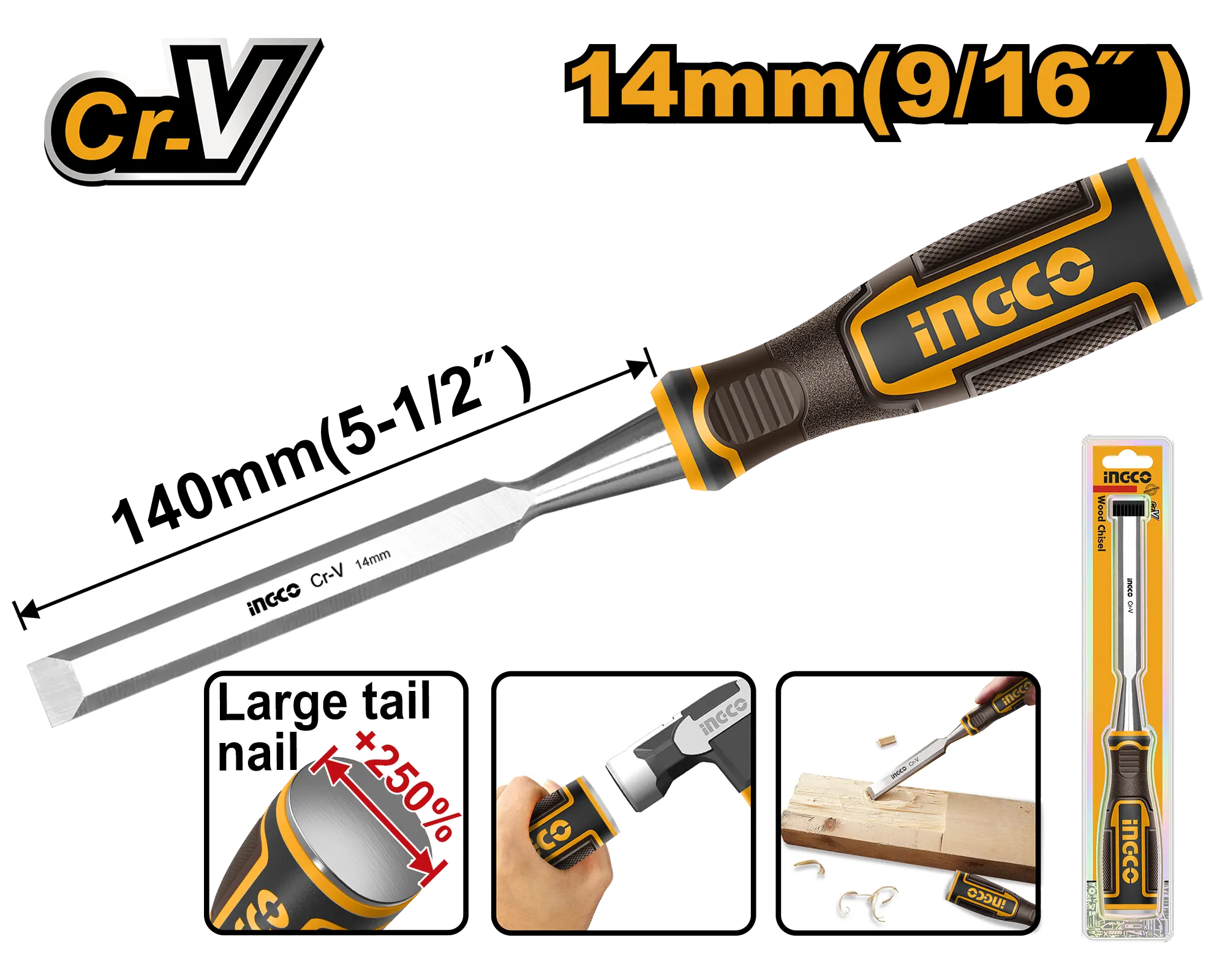 FORMON 14MM INGCO es un producto dentro de la categoría Herramientas manuales. Marca detectada: Ingco. Producto orientado a uso práctico según su nombre y datos detectables, con foco en compatibilidad. Datos detectados: Medida: 14 mm. Nota: Ancho: 14 mm \nLongitud: 140 mm \nCincel para madera, Cr-V \nEnvasado en blister doble nan.