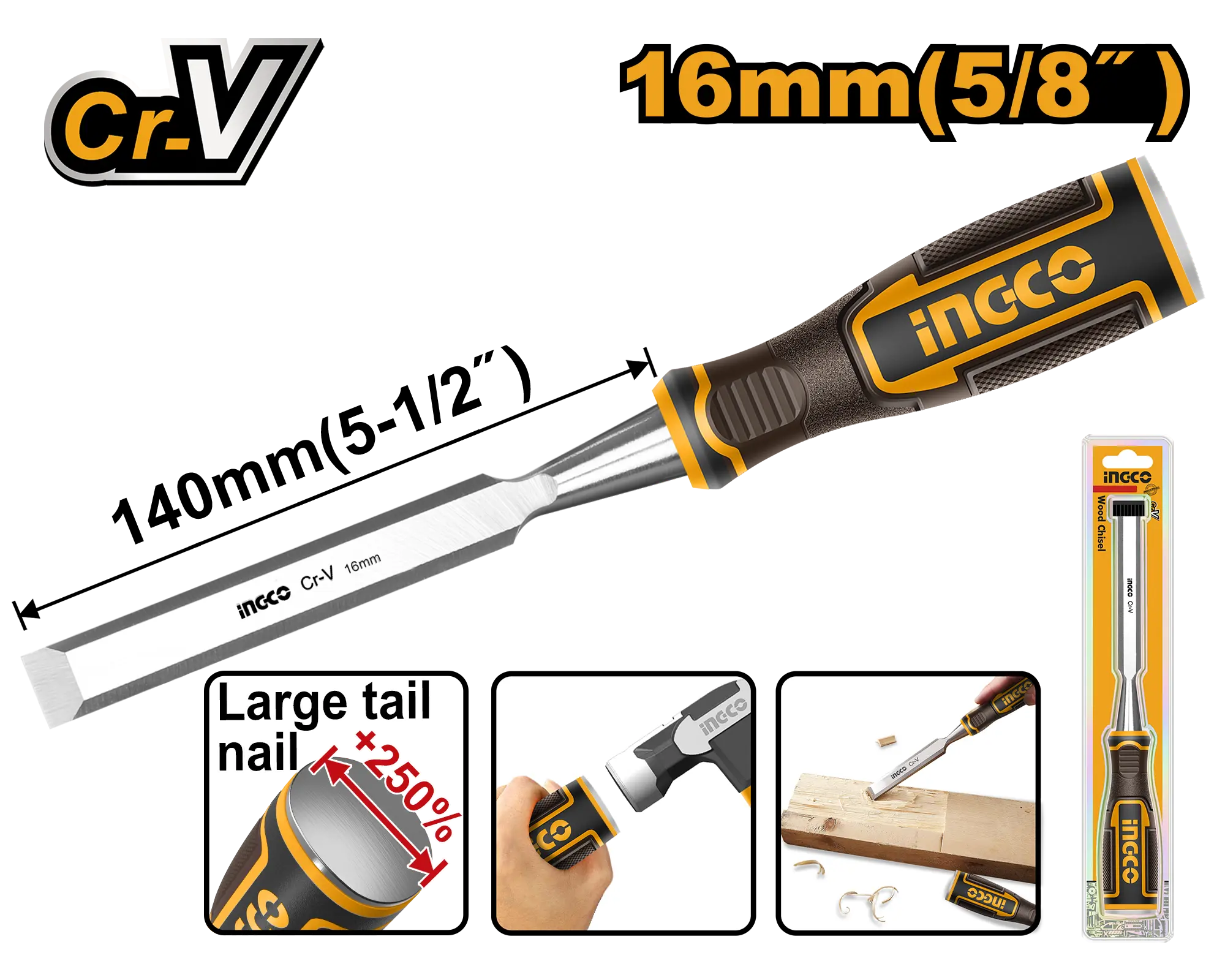 FORMON 16MM INGCO es un producto dentro de la categoría Herramientas manuales. Marca detectada: Ingco. Producto orientado a uso práctico según su nombre y datos detectables, con foco en compatibilidad. Datos detectados: Medida: 16 mm. Nota: Ancho: 16 mm \nLongitud: 140 mm \nCincel para madera, Cr-V \nEnvasado en blister doble nan.