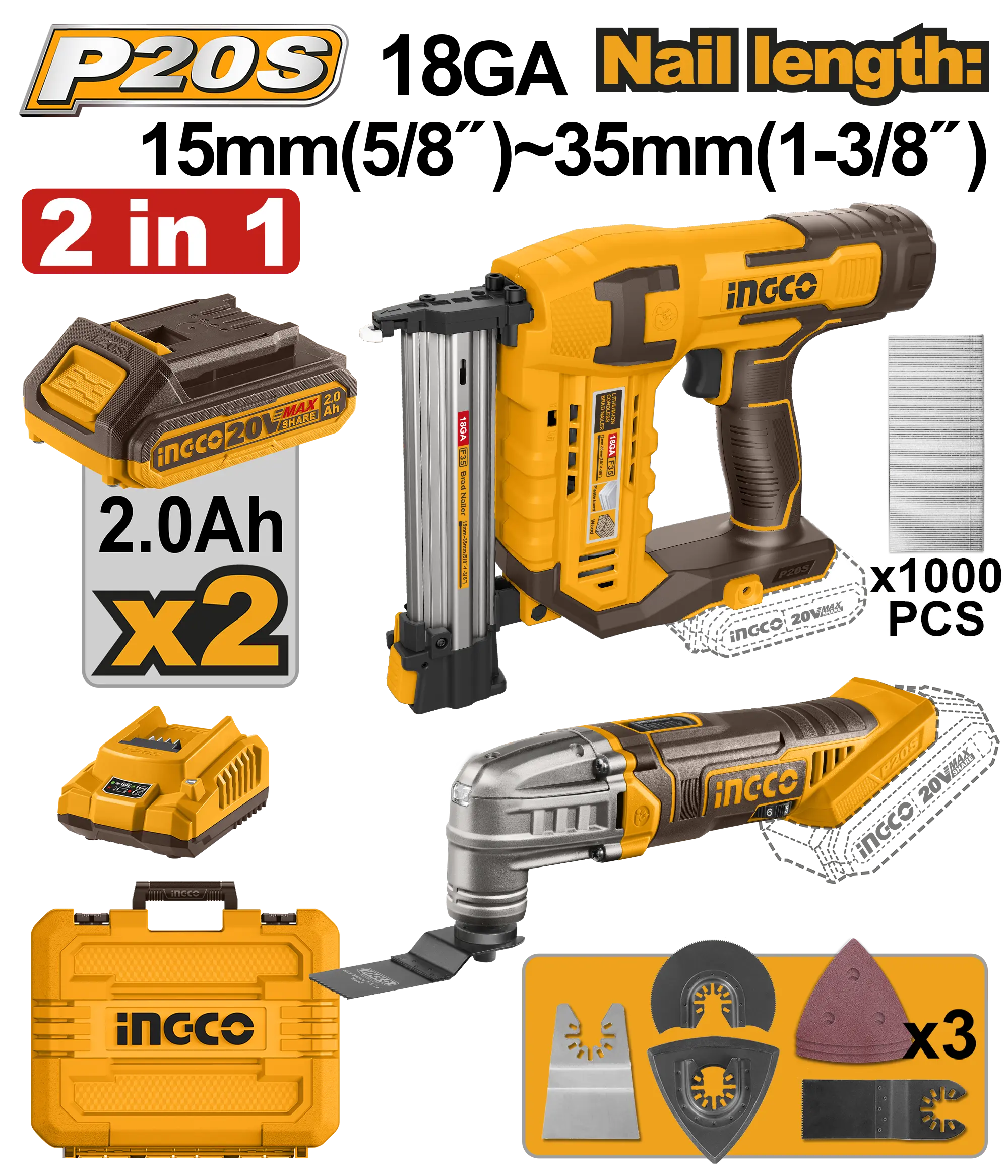 JUEGO COMBINADO DE 2 PIEZAS CLAVADORA INALAMBRICA DE IONES DE LITIO 15-35MM HERRAMIENTA MULTIFUNCION 20V INGCO es un producto dentro de la categoría Herramientas inalámbricas. Marca detectada: Ingco. Producto orientado a uso práctico según su nombre y datos detectables, con foco en compatibilidad y seguridad. Datos detectados: Voltaje: 20 V; Medida: 35 mm.
