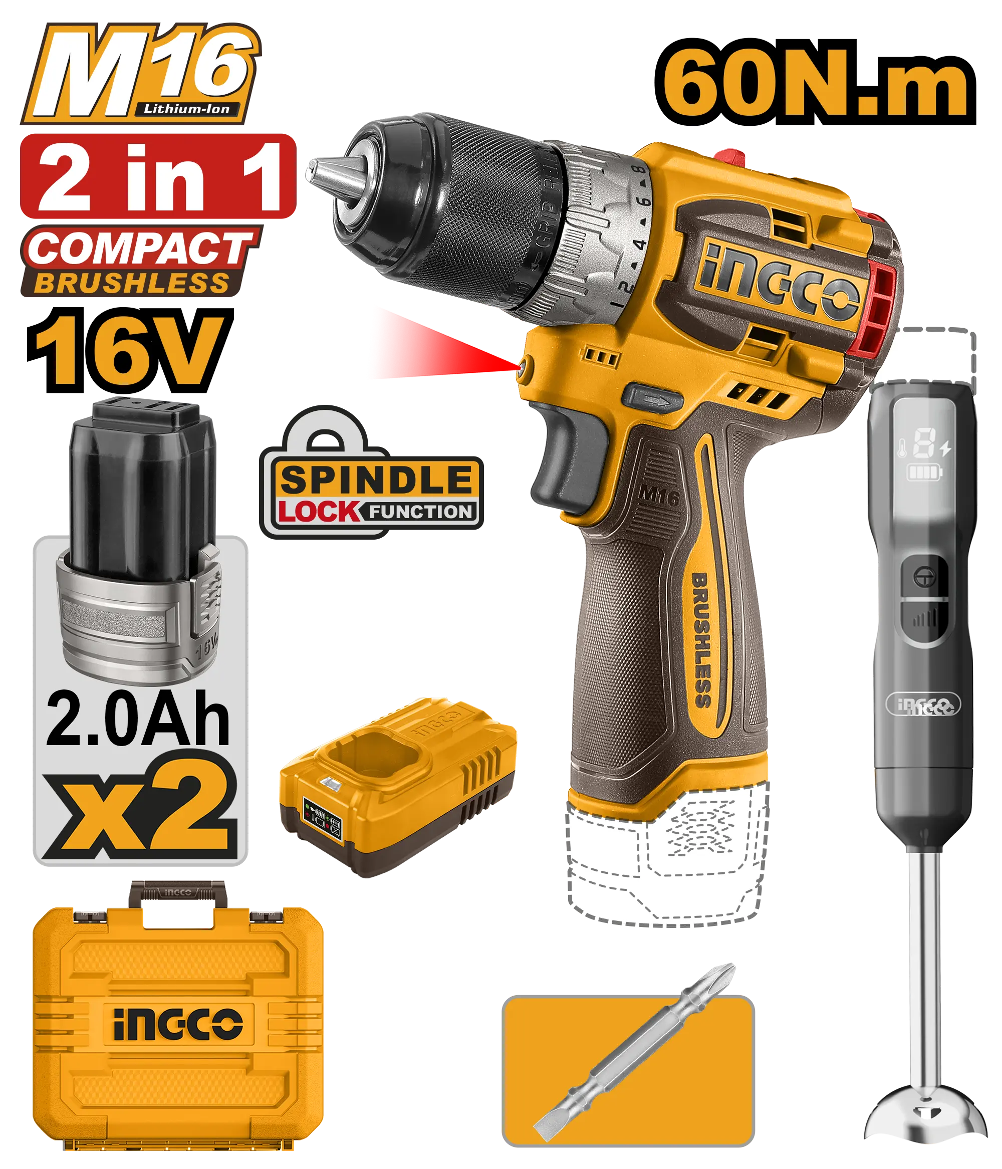 JUEGO COMBINADO DE 2PCS TALADRO INALAMBRICO 1/2″ BL 16V 60N.M + BATIDORA + 2 BAT 2.0AH + CARG + MALETA INGCO es un producto dentro de la categoría Herramientas inalámbricas. Marca detectada: Ingco. Producto orientado a uso práctico según su nombre y datos detectables, con foco en compatibilidad y seguridad. Datos detectados: Potencia: 100 W; Voltaje: 16 V; Batería: 2.0 Ah; Velocidad: 2000 RPM; Diámetro: 2″; Medida: 65 mm. Nota: Voltaje: 16V \n1 pieza Taladro compacto inalámbrico sin escobillas CDLI16681 \n1 Uds Batidora de mano inalámbrica CHB047K \n.