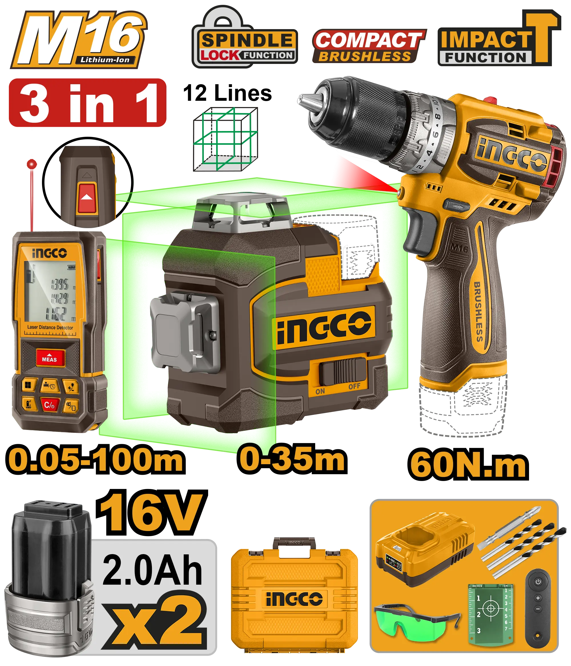 - Producto: JUEGO COMBINADO DE 3 PIEZAS TALADRO DE IMPACTO 1/2″ BL 16V 60N.M + NIVEL DE LASER AUTONIVELANTE 12 LINEAS + MEDIDOR DE DISTANCIA LASER 100M + 2 BAT 2.0AH + CARGADOR + MALETA INGCO
