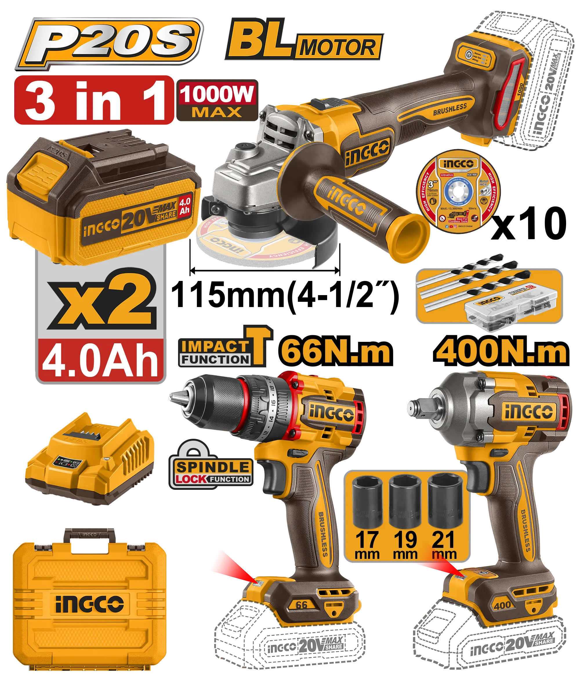 JUEGO COMBINADO DE 3 PIEZAS TALADRO DE IMPACTO 1/2″ BL 20V 66N.M + AMOLADORA ANGULAR 4-1/2″ BL 20V 9000RPM + LLAVE DE IMPACTO 1/2″ BL 20V 400N.M + 2 BAT 4.0AH + CARGADOR + MALETA INGCO