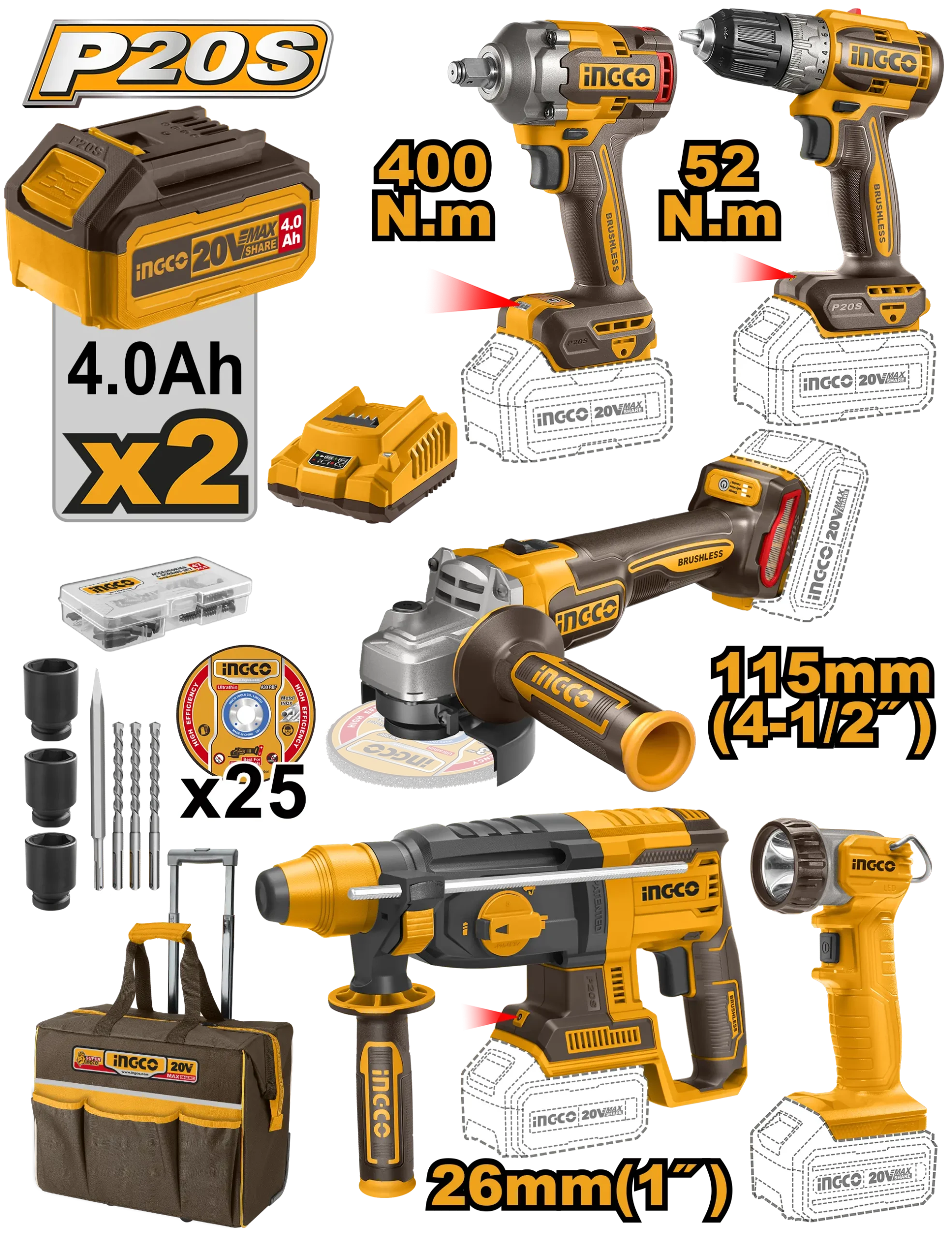 JUEGO COMBINADO DE 5 PIEZAS TALADRO INALAMBRICO 3/8 + LLAVE DE IMPACTO 1/2 + ROTOMARTILLO 2.0J + AMOLADORA ANGULAR 4 1/2 + LAMPARA + 2 BAT 4.0AH + CARG + MALETA INGCO. es un producto dentro de la categoría Herramientas inalámbricas. Marca detectada: Ingco. Herramienta para demolición en concreto/mampostería; el cincel correcto y trabajo por secciones mejora control. Datos detectados: Potencia: 5 W; Voltaje: 20 V; Batería: 4.0 Ah; Velocidad: 2300 RPM; Diámetro: 2″; Medida: 26 mm. Nota: Voltaje: 20 V \n Con 1 taladro inalámbrico sin escobillas CDLI204531 \n.