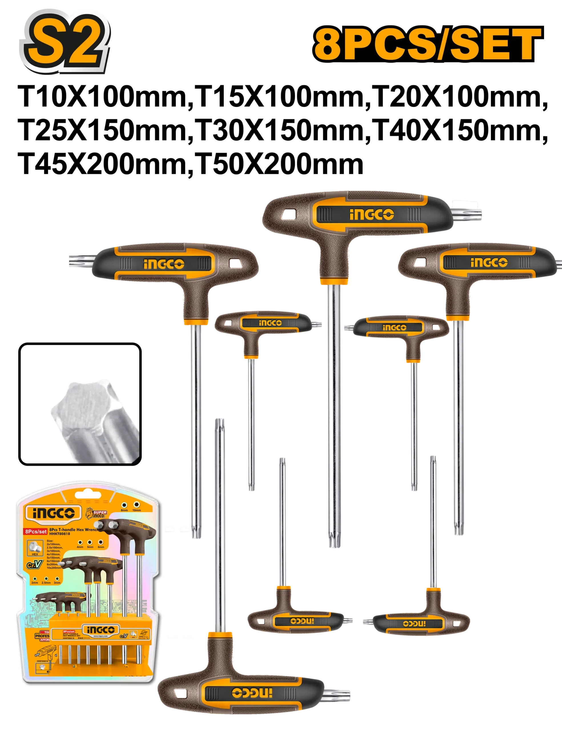 JUEGO DE LLAVES TORX CON MANGO EN T DE 8 PIEZAS INGCO. es un producto dentro de la categoría Herramientas manuales. Marca detectada: Ingco. Producto orientado a uso práctico según su nombre y datos detectables, con foco en compatibilidad. Nota: Estante exclusivo de marca \nEmbalado en doble blister.