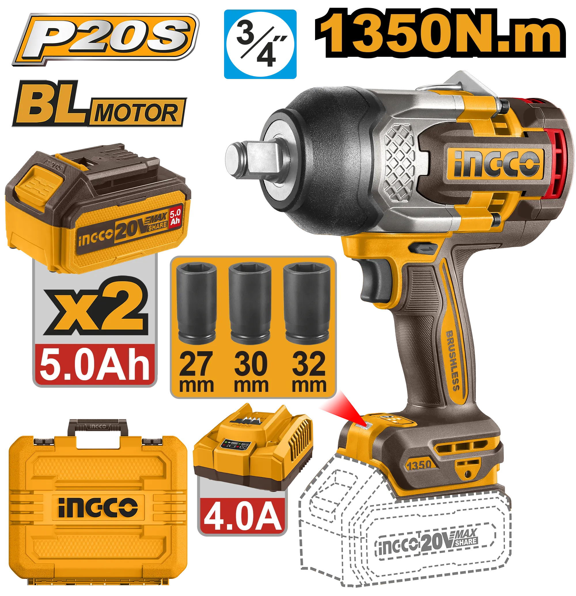 LLAVE DE IMPACTO INALAMBRICA 3/4″ BL 20V 1350N.M + 2 BAT 5.0AH + CARG + MALETA INGCO