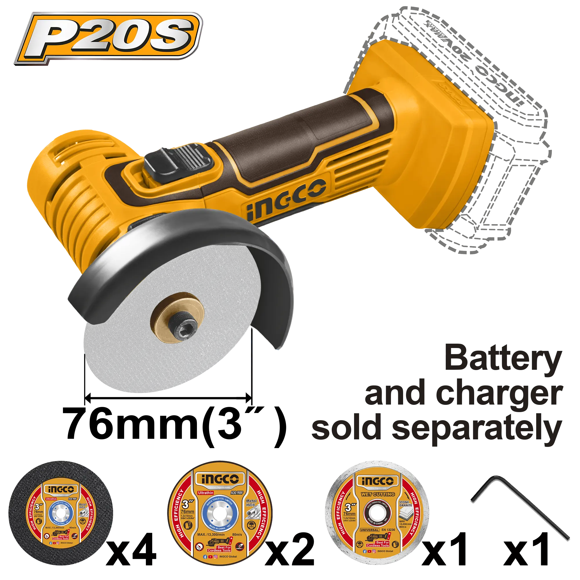 MINI AMOLADORA 3″» 20V INGCO es un producto dentro de la categoría Herramientas inalámbricas. Marca detectada: Ingco. Equipo de banco para afilado y desbaste ligero; clave: muela adecuada y no sobrecalentar la pieza. Datos detectados: Voltaje: 20 V; Velocidad: 19500 RPM; Diámetro: 3″; Medida: 76 mm. Nota: \nLa batería y el cargador se venden por separado.