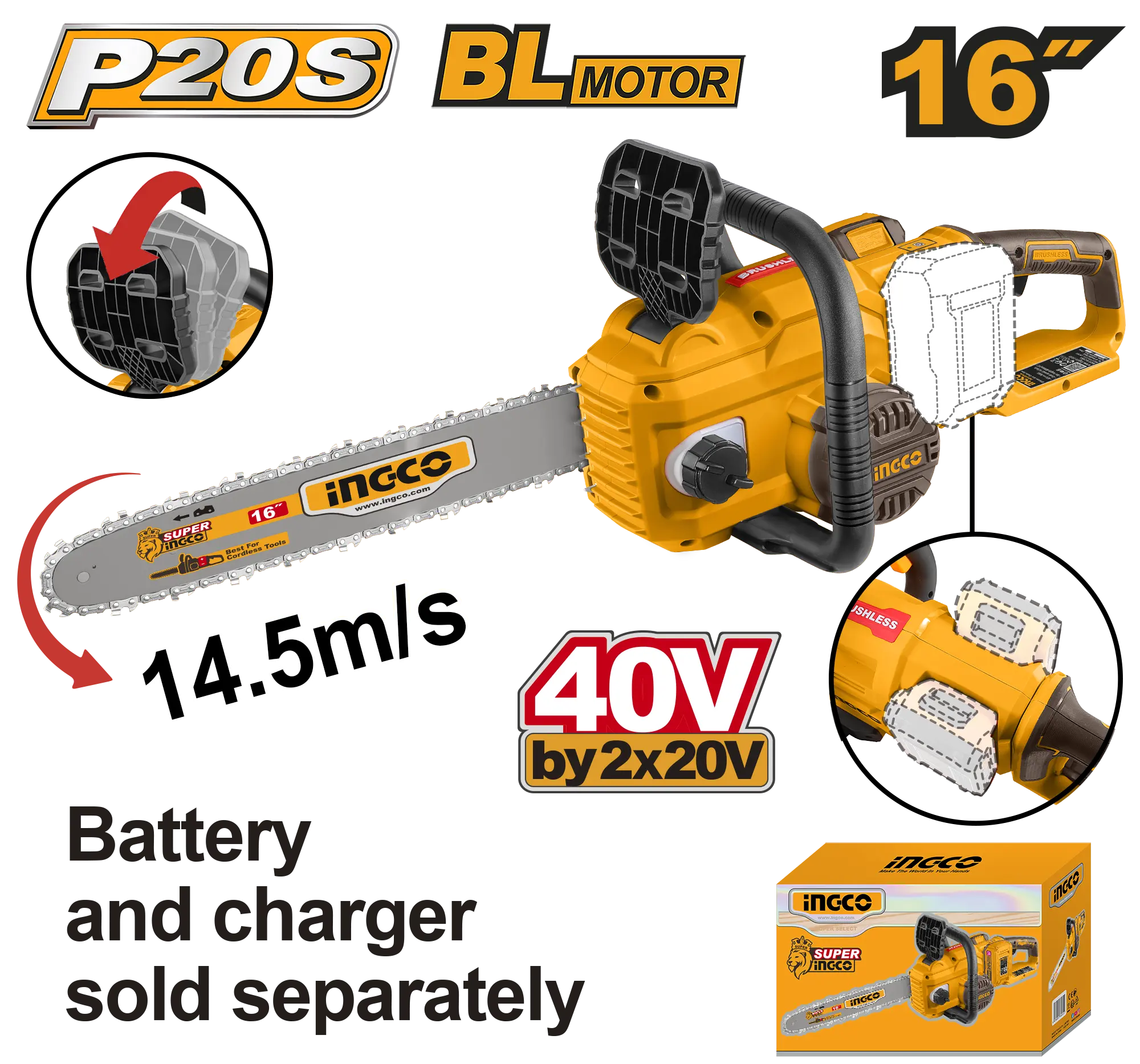 - Producto: MOTOSIERRA DE IONES DE LITIO 16″» BL 40V INGCO