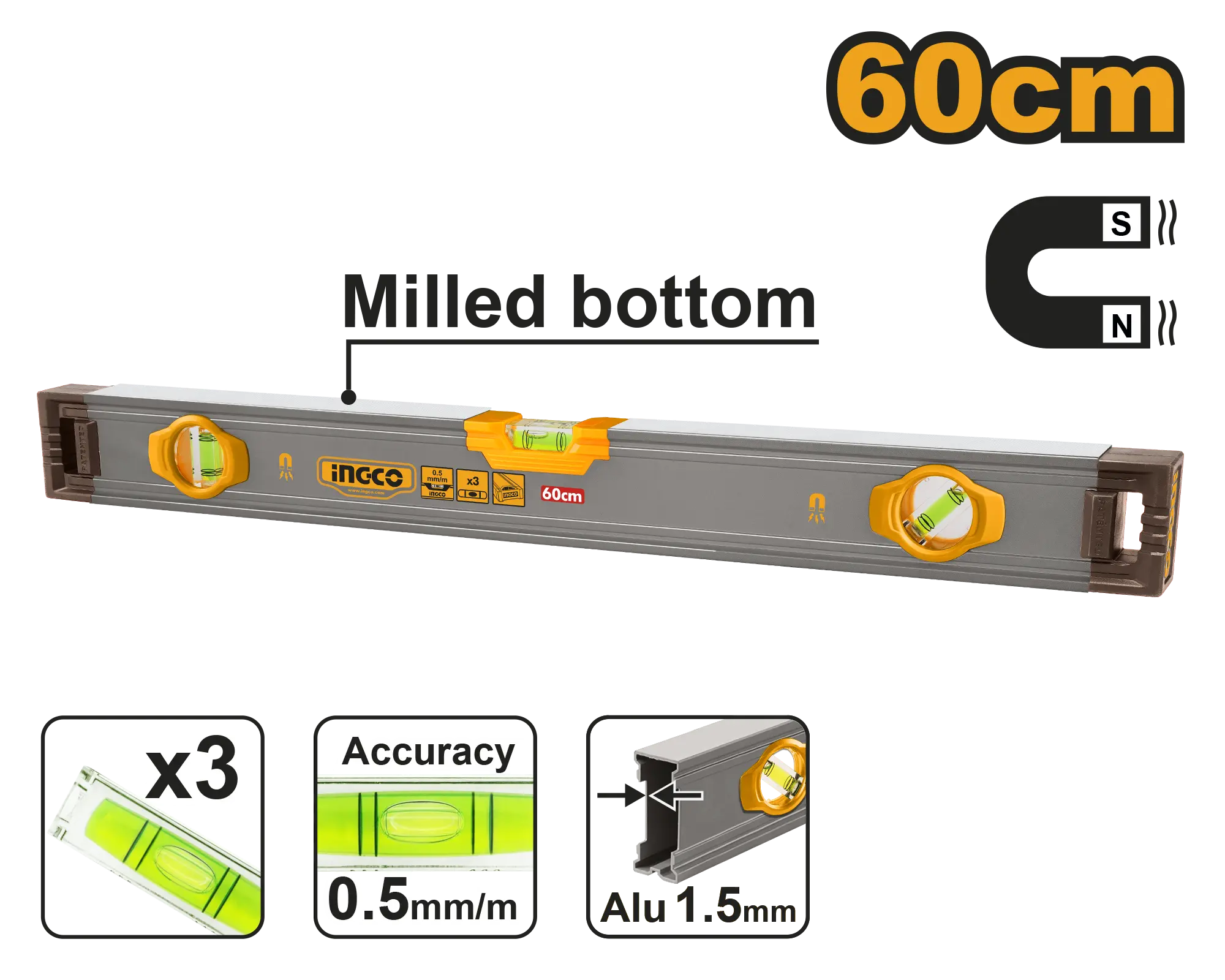 NIVEL TORPEDO 60CM INGCO es un producto dentro de la categoría Herramientas manuales. Marca detectada: Ingco. NIVEL TORPEDO 60CM INGCO es un herramientas orientado a uso práctico y seguro. Datos detectados: Medida: 0.5 mm.