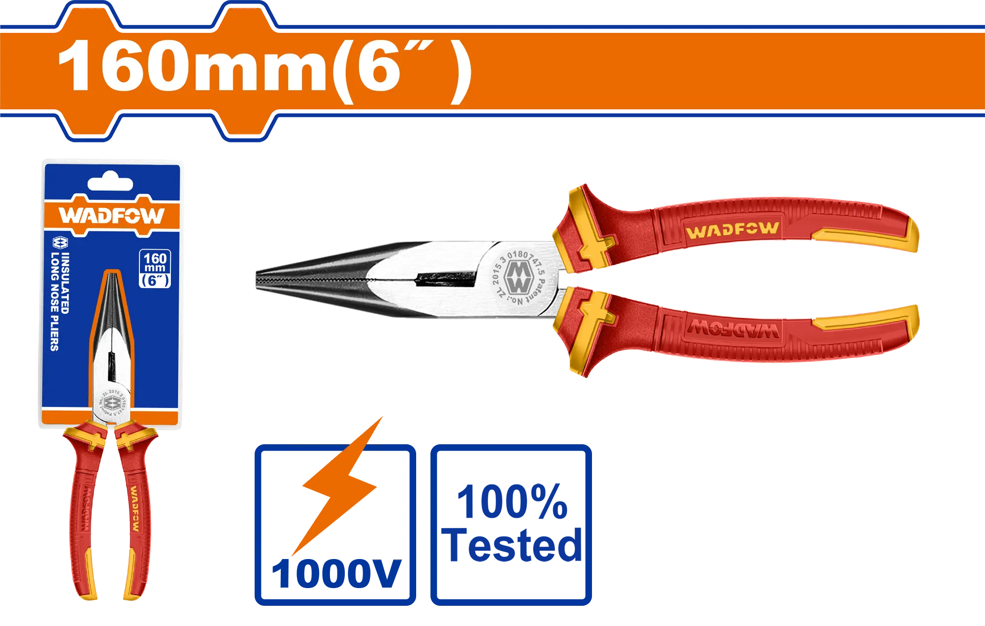 - Producto: PINZA PUNTA LARGA AISLADO ELECTRICISTA 6″ 1000V WADFOW