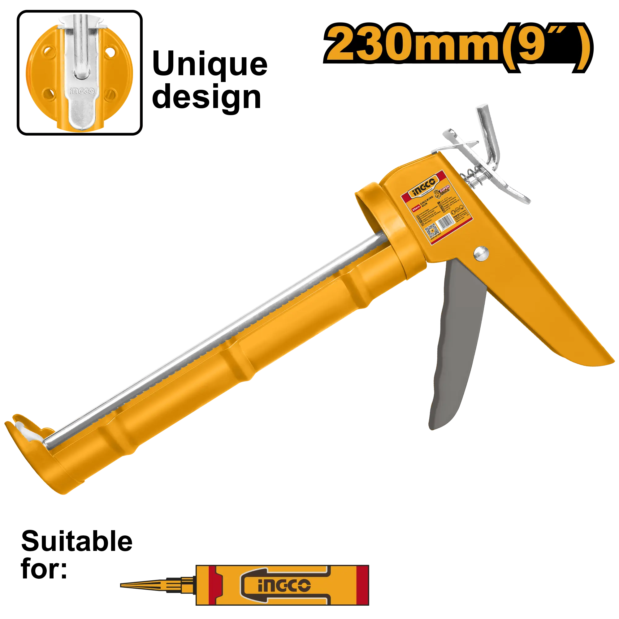 PISTOLA PARA SILICON METAL 9" SUPER SELECT INGCO es un producto dentro de la categoría Herramientas manuales. Marca detectada: Ingco. PISTOLA PARA SILICON METAL 9" SUPER SELECT INGCO es un herramientas orientado a uso práctico y seguro. Datos detectados: Diámetro: 9"; Medida: 230 mm. Nota: Pistola de calafateo de 9" \nVástago de hierro con dientes Longitud: 230mm 9"\n Espesor: 0.8mm \nDiámetro: 51mm \nEnbalado por etiqueta nan.