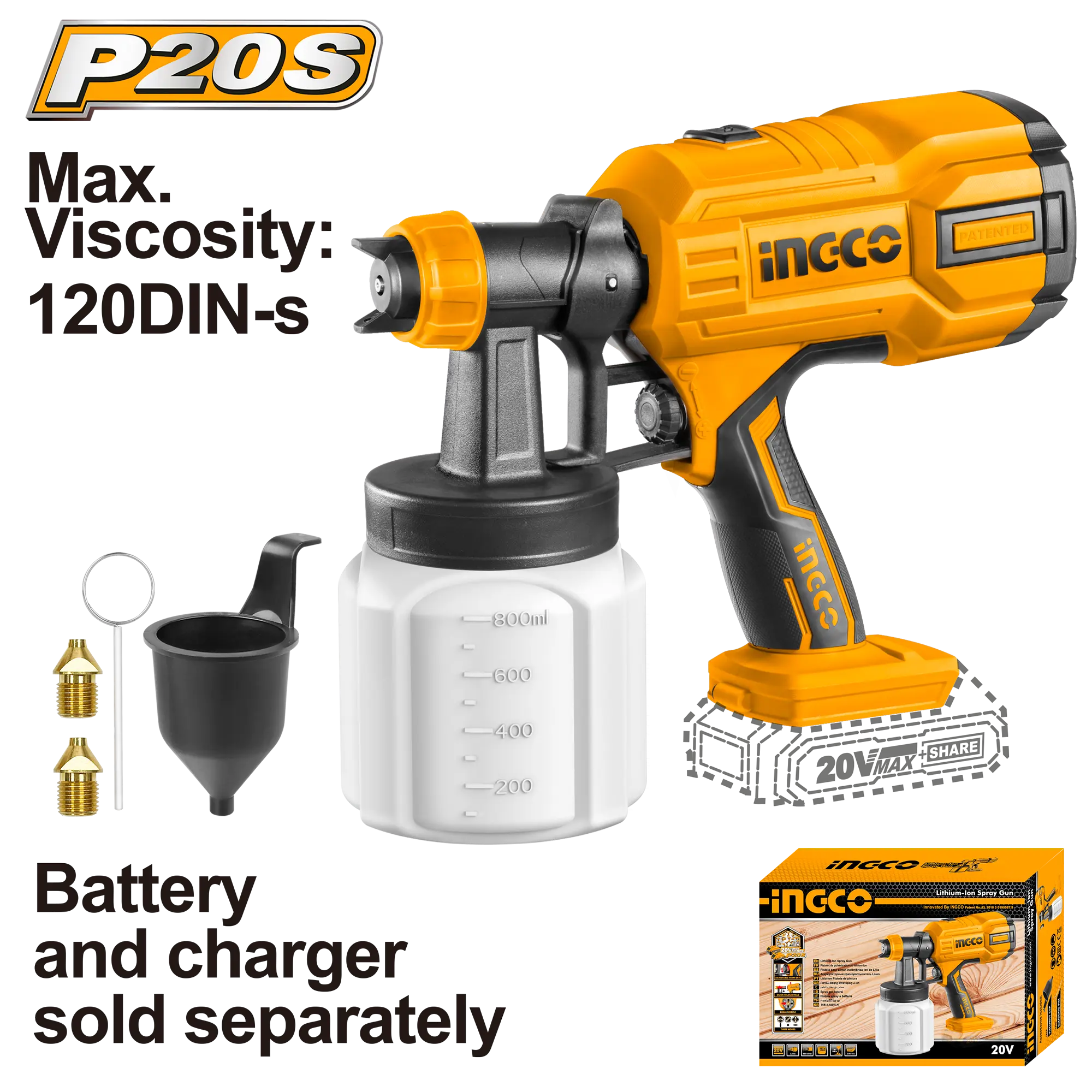 - Producto: PISTOLA ROCIADORA INALAMBRICA 800ML/MIN 20V INGCO