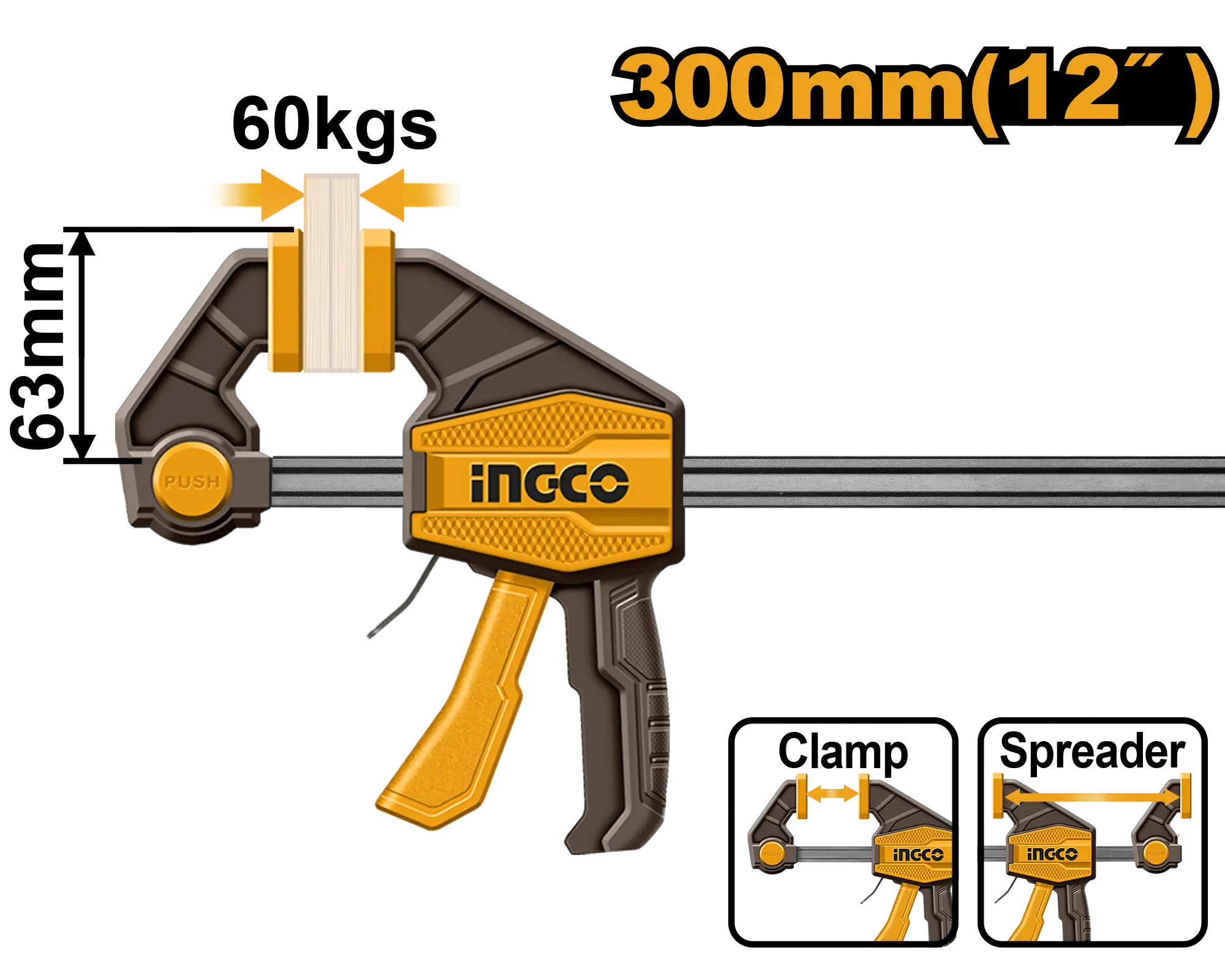 PRENSA DE BARRA RAPIDA 63X300MM INGCO es un producto dentro de la categoría Herramientas manuales. Marca detectada: Ingco. PRENSA DE BARRA RAPIDA 63X300MM INGCO es un herramientas orientado a uso práctico y seguro. Datos detectados: Medida: 300 mm. Nota: Tamaño de abrazadera: 63×300 mm Fuerza máxima de abrazadera: 60 kg Grosor y ancho de la regla de hierro: 5X18 mm \nEmbalado por etiqueta nan.