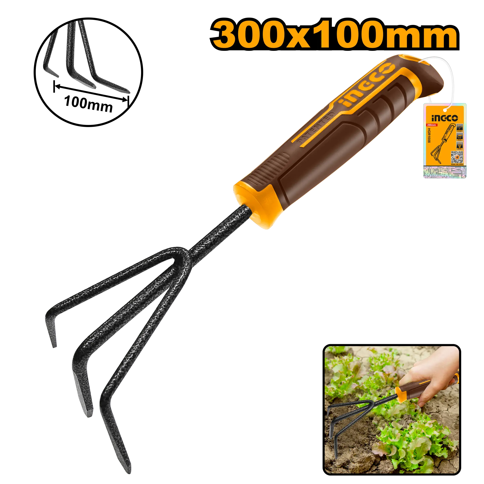 RASTRILLO DE JARDIN 300MM INGCO es un producto dentro de la categoría Herramientas manuales. Marca detectada: Ingco. RASTRILLO DE JARDIN 300MM INGCO es un herramientas orientado a uso práctico y seguro. Datos detectados: Medida: 300 mm. Nota: Longitud total: 300mm\nDiseño exclusivo de mango de patente INGCO.\nAncho: 100mm\nVarilla principal: 8.0mm\nMaterial: acero al carbono nan.