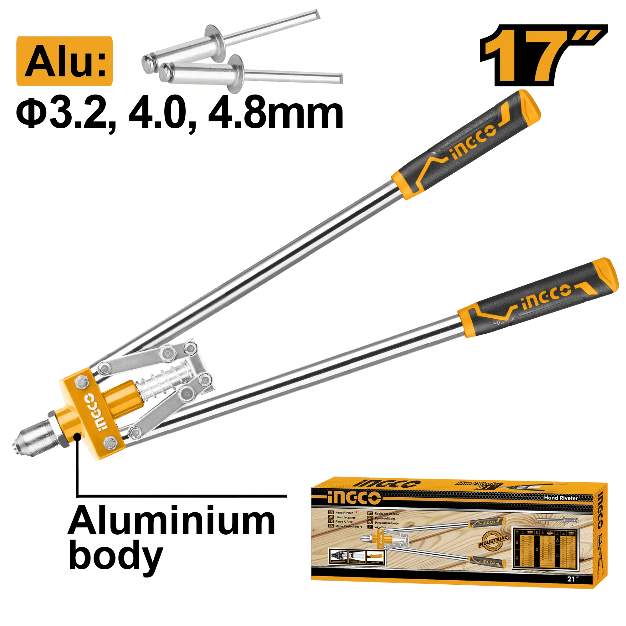 REMACHADORA TIPO TIJERA 17″ INGCO es un producto dentro de la categoría Herramientas manuales. Marca detectada: Ingco. REMACHADORA TIPO TIJERA 17″ INGCO es un herramientas orientado a uso práctico y seguro. Datos detectados: Diámetro: 17″; Medida: 420 mm. Nota: tamaño:420mm,17″\nRemache aplicable tamaño:3.2mm,4mm,4.8mm\nMaterial:Acero+Alumnio\nCon mano de goma de diseño único\nEmpaquetado por caja de color nan.