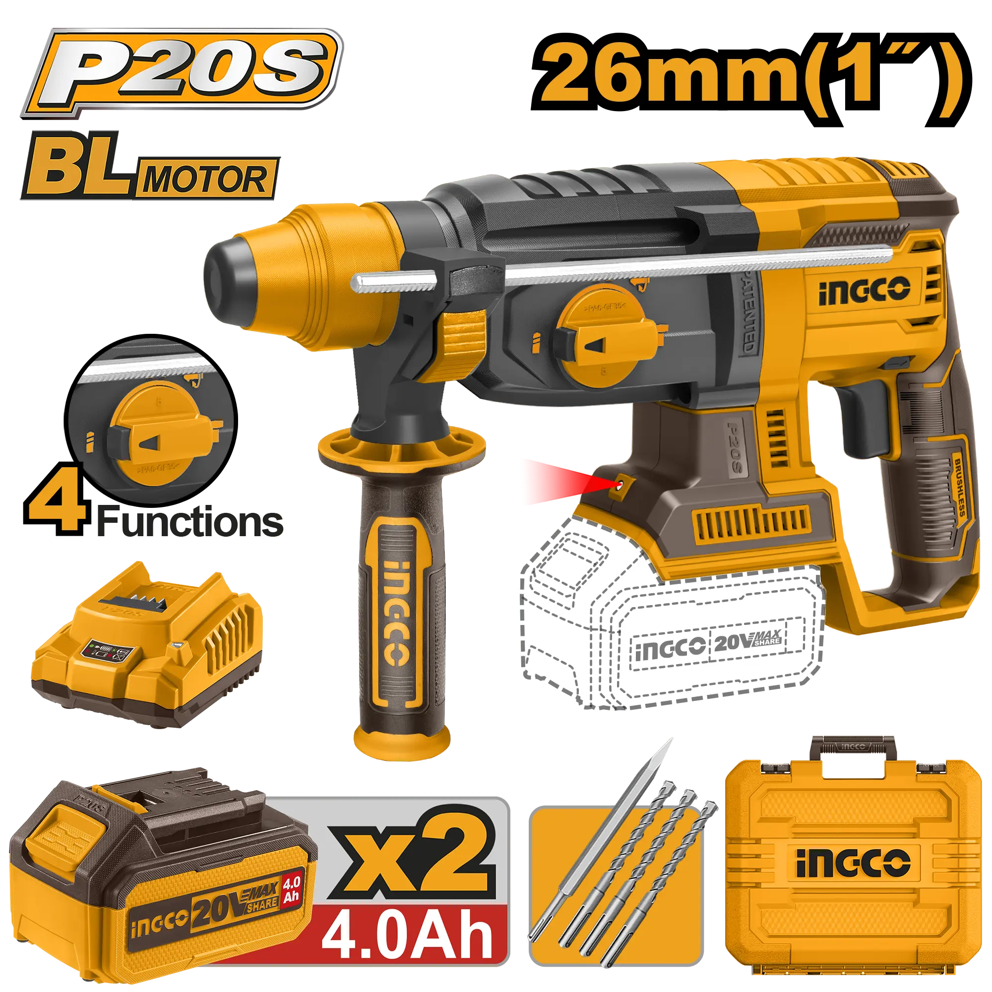 - Producto: ROTOMARTILLO 1″» BL 20V 2,5J + 2 BAT 4.0AH + CARG + MALETA INGCO