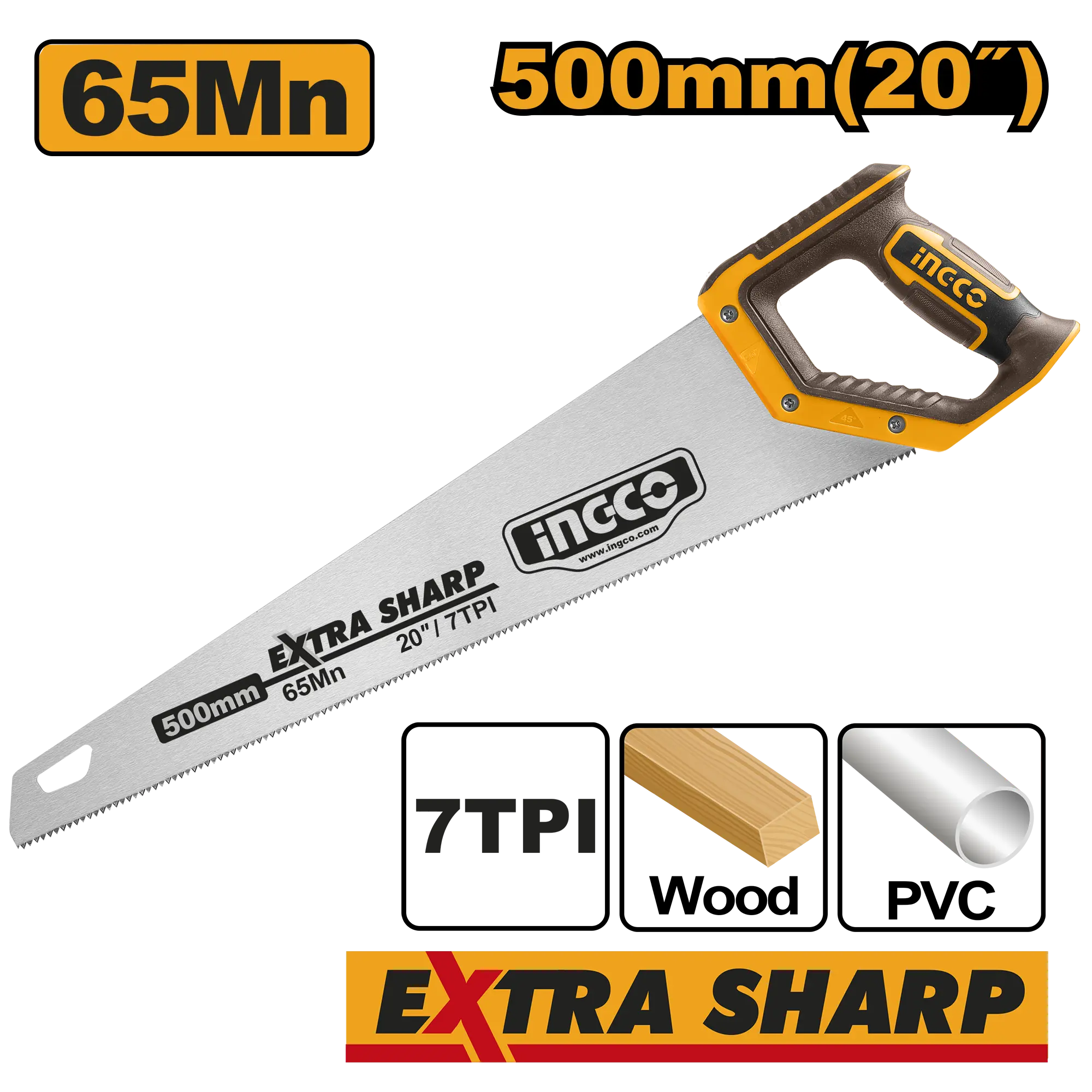 SERRUCHO 500MM INGCO es un producto dentro de la categoría Herramientas manuales. Marca detectada: Ingco. SERRUCHO 500MM INGCO es un herramienta manual orientado a uso práctico y seguro. Datos detectados: Diámetro: 20″; Medida: 500 mm. Nota: Tamaño: 20″ 500 mm \nEspesor: 0,9 mm, 7TPI \nMaterial: 65Mn \nCon protector de dientes \nTratamiento térmico \nEmbalado en tarjeta de papel nan.