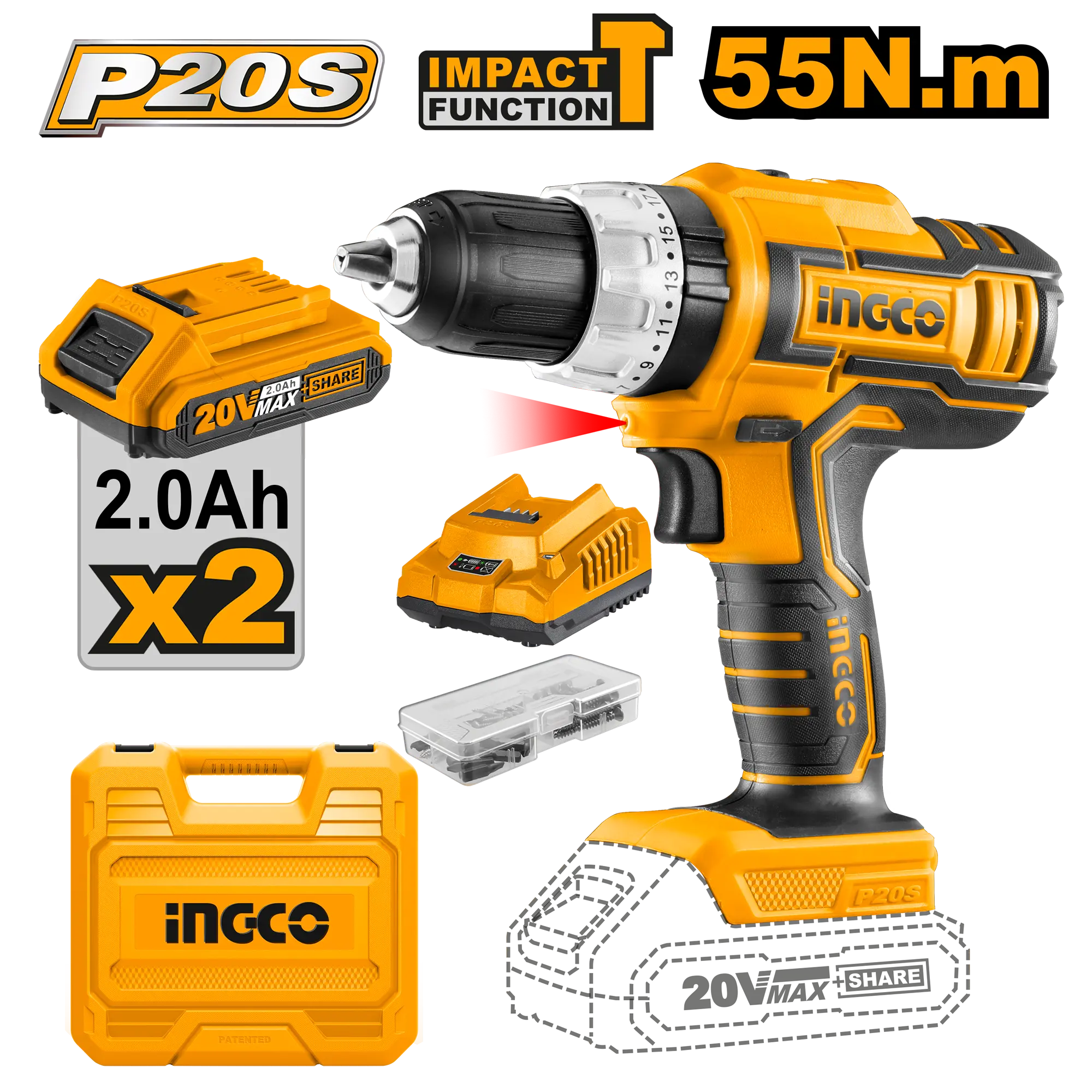 TALADRO INALAMBRICO 1/2″» 20V 55N.M + 2 BAT 2.0AH + CARG + MALETA INGCO es un producto dentro de la categoría Herramientas inalámbricas. Marca detectada: Ingco. Herramienta de perforación y atornillado; el resultado depende de la broca correcta y de la velocidad adecuada al material. Datos detectados: Voltaje: 20 V; Batería: 2.0 Ah; Velocidad: 1900 RPM; Diámetro: 2″. Nota: Voltaje: 20V \nVelocidad sin carga: 0 120V ~ 50 / 60Hz Luz de trabajo integrada Indicador LED de carga de la batería \nCon 2pcs 2.
