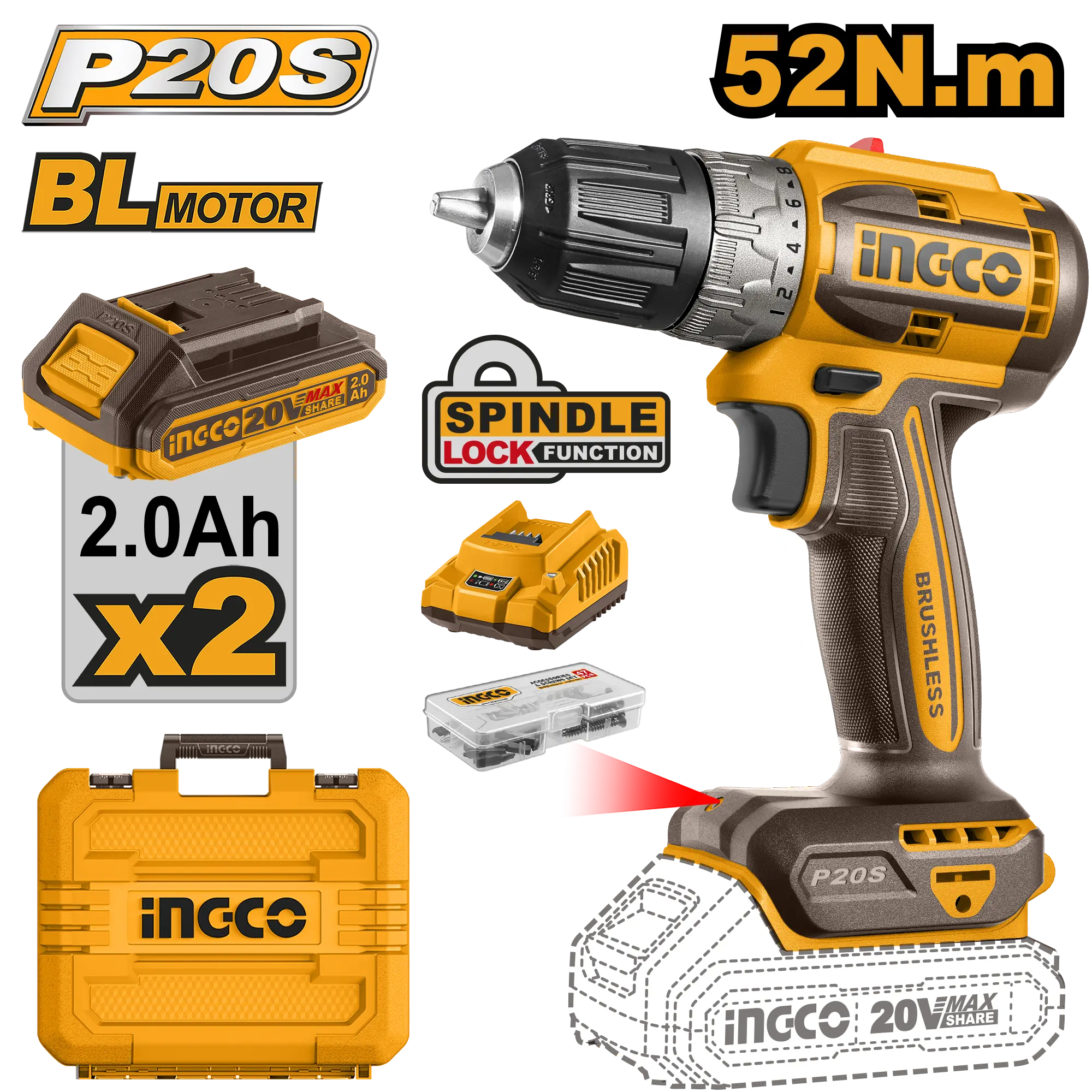 TALADRO INALAMBRICO 3/8″» BL 20V 52N.M + 2 BAT 2.0AH + CARG + MALETA INGCO es un producto dentro de la categoría Herramientas inalámbricas. Marca detectada: Ingco. Herramienta de perforación y atornillado; el resultado depende de la broca correcta y de la velocidad adecuada al material. Datos detectados: Voltaje: 20 V; Batería: 2.0 Ah; Velocidad: 2000 RPM; Diámetro: 8″; Color: Transparente. Nota: Motor sin escobillas \nVoltaje: 20V \nVelocidad en vacío: 0 2000rpm \nPar máximo: 52 Nm \nMandril de plástico \nCapacidad del mandril: 1/32.
