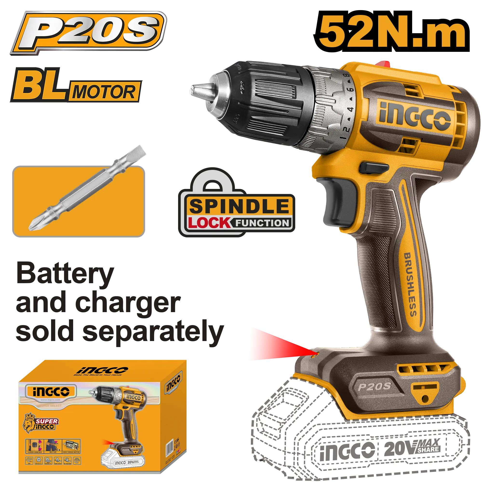 - Producto: TALADRO INALAMBRICO 3/8″» BL 20V 52N.M INGCO