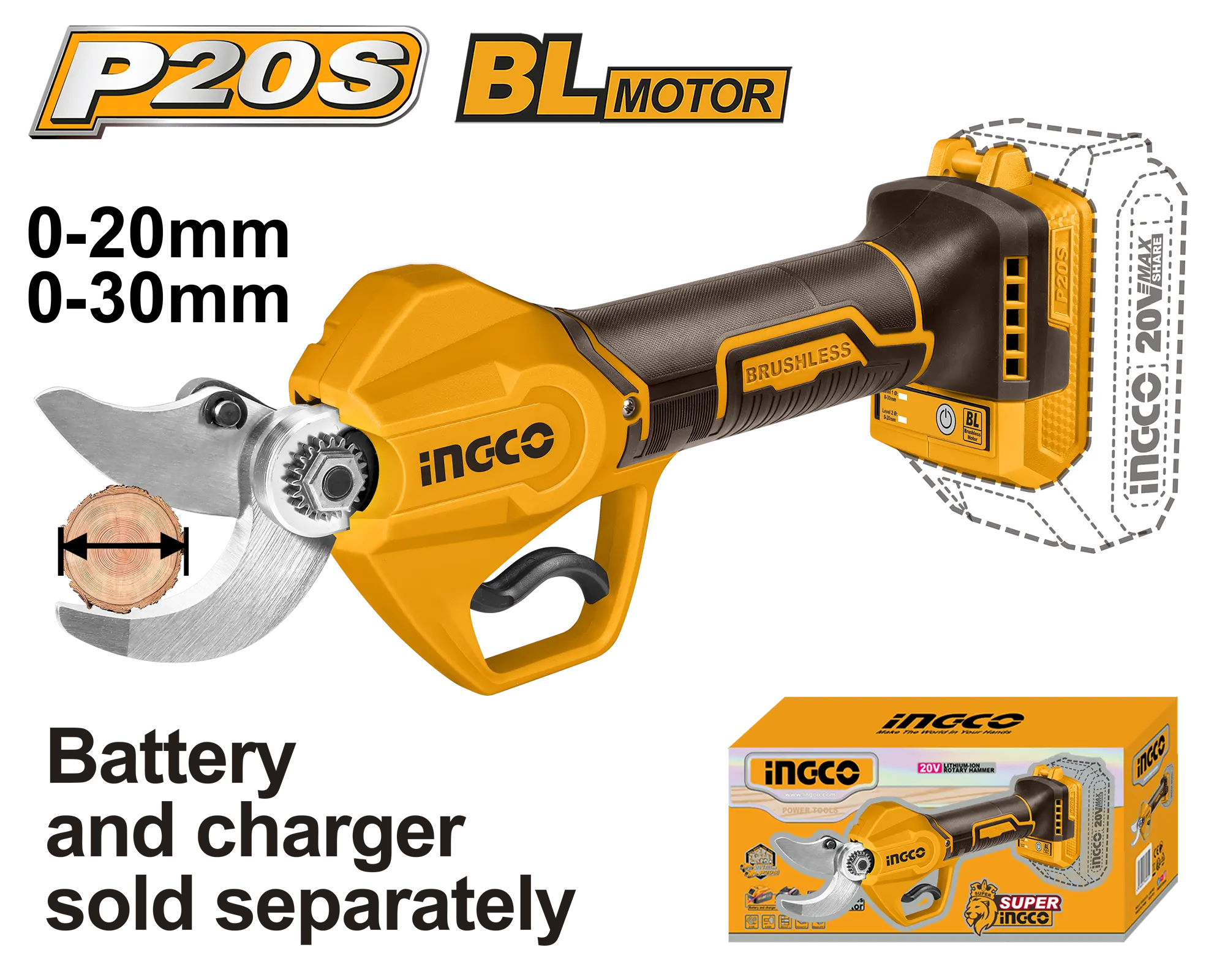 - Producto: TIJERA DE PODAR INALAMBRICA 30MM BL 20V INGCO